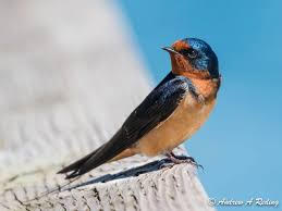 The Sibley Field Guide to Birds of Eastern North America states, "swallows are aerial songbirds with very short legs and bills and relatively long and pointed wings. They feed almost exclusively on flying insects captured in graceful swooping flight. The Barn Swallow has a blue-black upperside, whitish to orange underside, and a dark rufous throat. It's song is quiet and lilting with a husky squeaky quality."